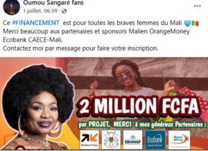 La publication sur Facebook date du 1er juillet 2025. Elle a généré plus de 100 j’aimes et une dizaine de commentaires. La légende dit  “Ce financement  est pour toutes les braves femmes du Mali. Merci beaucoup aux partenaires et sponsors Malien OrangeMoney Ecobank CAECE-Mali.”