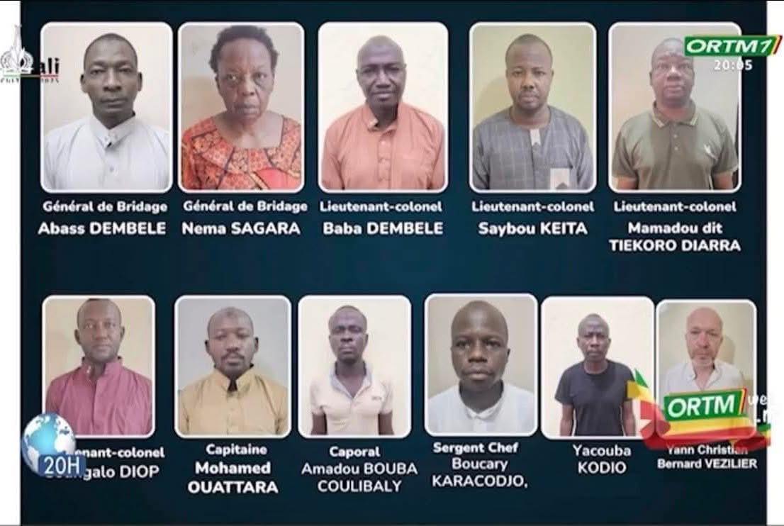 Selon le communiqué lu par le ministre de la sécurité et de la protection civile, le Général Daoud Aly Mohammedine, l’arrestation des militaires a eu lieu depuis le 01 Août dernier. À la diffusion des images 11 personnes arrêtées, les figures les plus connues sont celles des généraux de brigades, Abass Dembélé et Néma Sagara. Le premier a été relevé de ses fonctions de gouverneur de la région de Mopti en fin Mai dernier.