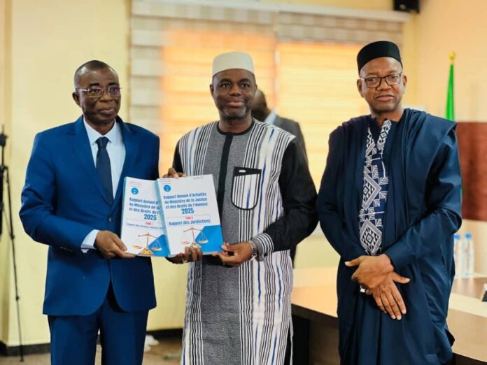 Ce lundi 30 mars, la salle de réunion du Ministère de la Justice et des Droits de l’Homme a accueilli la cérémonie de remise symbolique du rapport annuel d’activités 2025 des services centraux et assimilés ainsi que des juridictions. La cérémonie s’est tenue en présence du Ministre de la Justice et des Droits de l’Homme, garde des Sceaux, Mamoudou KASSOGUE, des membres du cabinet et du secrétariat, ainsi que de plusieurs acteurs du monde judiciaire.